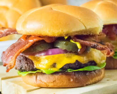 6) To assemble, spread peanut butter onto bottom halves of buns; spread ketchup onto top halves. Top the peanut butter with pickle slices, cooked onion, burgers with cheese, a slice of bacon, several tomato slices, and about 1/4 cup shredded lettuce per sandwich.